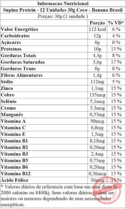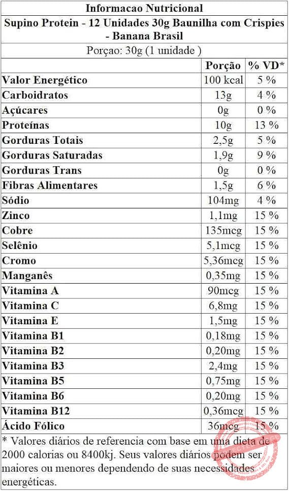| Ingredientes | Proteína isolada de soja, proteína concentrada do soro do leite (whey protein), colágeno hidrolisado, gordura vegetal, fibra de acácia, flocos de arroz e milho com cacau, albumina, cacau natural, leite integral, alfarroba, soro de leite, vitaminas e minerais (Vitamina C, Zinco, Vitamina E, Vitamina B3, Manganês, Vitamina B5, Vitamina A, Cobre, Vitamina B12, Vitamina B2, Vitamina B6, Vitamina B1, Ácido fólico, Cromo e Selênio), umectantes glicerina e sorbitol, edulcorante maltitol, emulsificantes lecitina de soja e poliglicerol polirricinoleato e aroma natural. NÃO CONTÉM GLÚTEN |