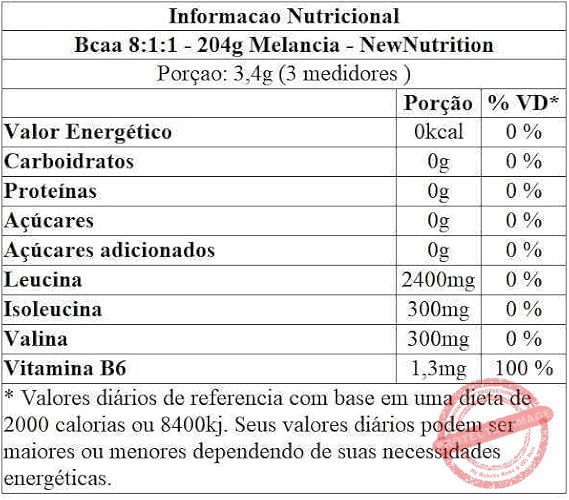 INGREDIENTES: L-Leucina, L-Isoleucina, L-Valina, ácido cítrico, aroma sintético idêntico ao natural de melancia, corante natural beterraba, edulcorante sucralose e vitamina B6.