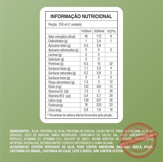 | Ingredientes | Ingredientes: Água, Proteína de soja, Proteína de ervilha, Cacau em pó, Fibra de chicória, Suco concentrado de abacaxi, Amido modificado, Óleo de girassol, Carbonato de cálcio, Sal, Suco concentrado de repolho, Vitamina D2, Vitamina B12, Aroma idêntico ao natural, Edulcorante artificial sucralose, Estabilizantes: goma gelana e fosfato dipotássico. |