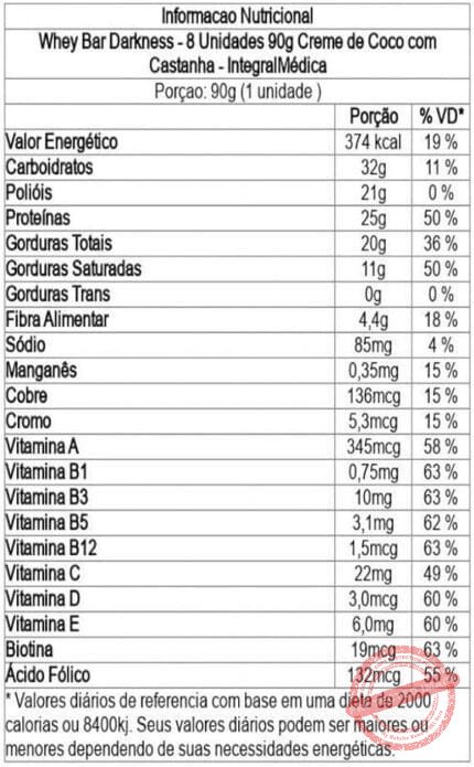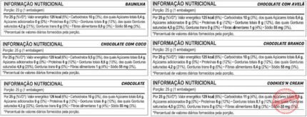 Mix de proteínas (Colágeno hidrolisado (Equaliv Body Protein Neutro), caseinato de cálcio, proteína concentrada de leite, proteína de soro do leite concentrada), cobertura sabor chocolate ao leite, creme de ganache sabor chocolate, xarope de tapioca, manteiga de cacau, (umectante) glicerol, xarope de polidextrose, cacau em pó, (emulsificante) lecitina, aromatizantes, (conservante) sorbato de potássio, (edulcorante) glicosídeos de esteviol de stevia rebaudiana bertoni e (antioxidante) dl-alfa-tocoferol.