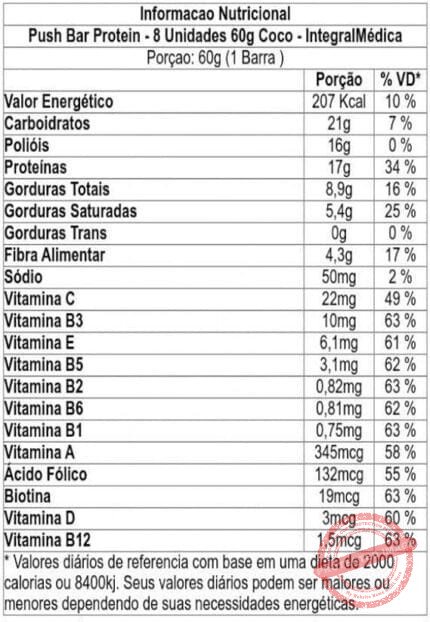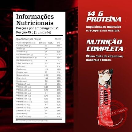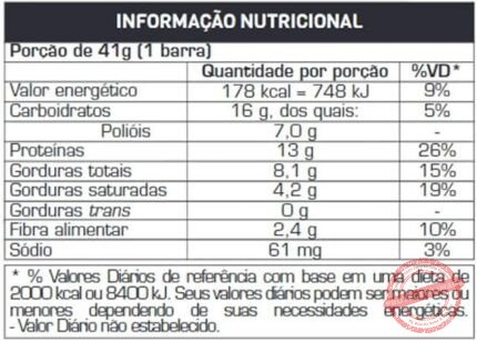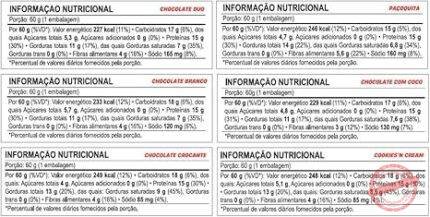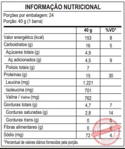 Ingredientes ‎Proteína concentrada do soro do leite, gordura de palma, manteiga de cacau, wafer, massa de cacau, flocos de arroz, cacau em pó, polidextrose, emulsificantes: lecitina de soja e polirricinoleato de poliglicerol, aromatizantes e edulcorantes: maltitol e sucralose.