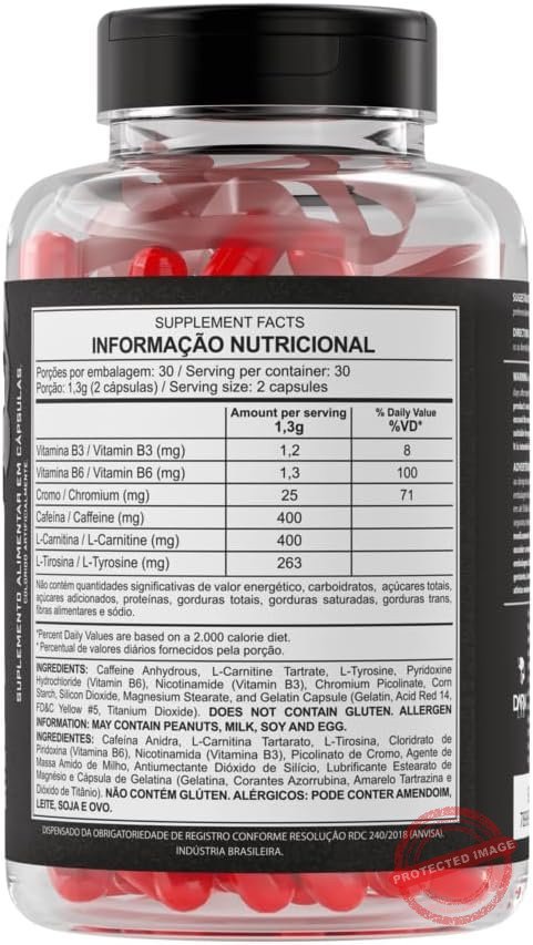 Cafeína anidra, L-Carnitina tartarato, L-Tirosina, Cloridrato de Piridoxina (Vitamina B6), Nicotinamida (Vitamina B3), Picolinato de Cromo, Agente de Massa Amido de Milho, Antiumectante Dióxido de Silício, Lubrificante Estearato de Magnésio e Cápsula de Gelatina (Gelatina, Corantes Azorrubina, Amarelo Tartrazina e Dióxido de Titânio).