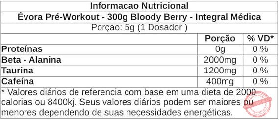 Beta-alanina, taurina, cafeína, acidulante ácido cítrico, aromatizante, antiumectante dióxido de silício, edulcorante sucralose e corante ponceau 4R.