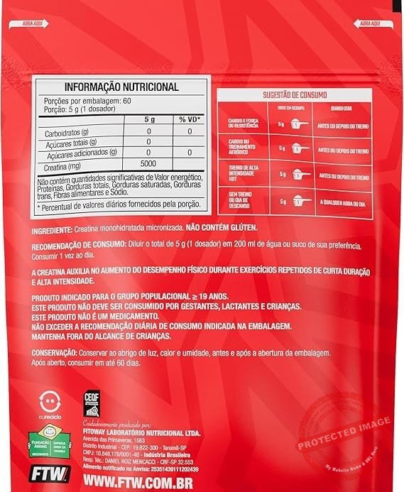 Creatina FTW é suplemento alimentar em pó à base de creatina monohidratada micronizada. Pode ser utilizado por pessoas adultas como parte de uma rotina alimentar equilibrada e associada à prática de atividade física.