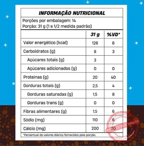 Proteína concentrada do soro do leite (whey); Cacau em pó; Biscoito triturado (fécula de mandioca, farinha de arroz, gordura de palma, polidextrose, cacau, banana verde, sal, fermento químico bicarbonato de sódio e edulcorantes maltitol e sucralose); Aroma natural de brownie; Emulsificante goma xantana; Estabilizante cloreto de potássio; Edulcorante sucralose. ** NÃO CONTÉM GLÚTEN. ** CONTÉM LACTOSE.