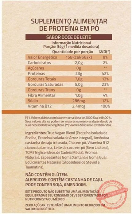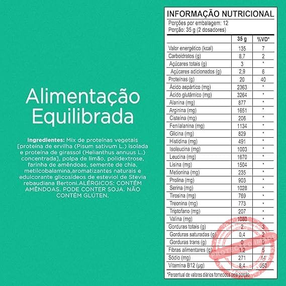 Mix de proteínas vegetais [proteína de ervilha isolada (Pisum sativum L.) e proteína de girassol concentrada (Helianthus annuus L.)], polpa de limão, polidextrose, farinha de amêndoas, semente de chia, metilcobalamina, aromatizantes e edulcorante glicosídeos de esteviol (estévia). ALÉRGICOS: CONTÉM AMÊNDOAS. NÃO CONTÉM GLÚTEN. Contém aromatizante.