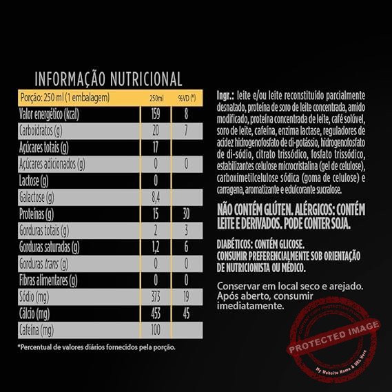 Ingr.: ​​​​leite e/ou leite reconstituído parcialmente desnatado, proteína concentrada de leite, proteína de soro de leite concentrada, amido modificado, café solúvel, soro de leite, cafeína, estabilizantes celulose microcristalina, citrato de sódio, carboximetilcelulose sódica e goma gelana, reguladores de acidez fosfato dipotássico e fosfato dissódico, aromatizante e edulcorante sucralose