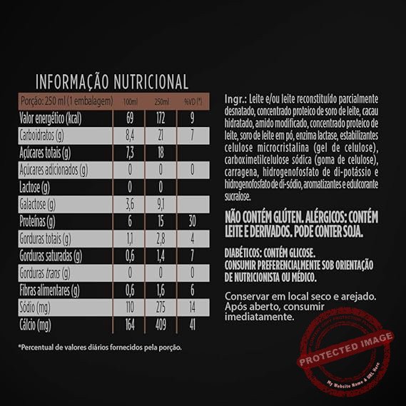 Leite parcialmente desnatado, concentrado proteico de leite em pó, amido modificado, concentrado proteico de soro de leite em pó, enzima lactase, estabilizantes celulose microcristalina, carboximetilcelulose, carragena, fosfato dipotássico e fosfato dissódico, aromatizantes, corante natural carmim e edulcorante sucralose. ÃO CONTÉM GLÚTEN. ALÉRGICOS: CONTÉM LEITE E DERIVADOS. PODE CONTER SOJA. DIABÉTICOS: CONTÉM GLICOSE. CONSUMIR PREFERENCIALMENTE SOB A RECOMENDAÇÃO DE NUTRICIONISTA OU MÉDICO