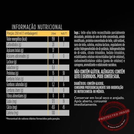 Leite semidesnatado, soro de leite reconstituído, xarope de cacau, caseinato de cálcio, concentrado protéico de soro de leite, amido modificado, cloreto de sódio, estabilizantes carboximetilcelulose sódica, fosfato dissódico, fosfato dipotássico, celulose microcristalina e carragena, aromatizante, enzima lactase e edulcorante sucralose.
