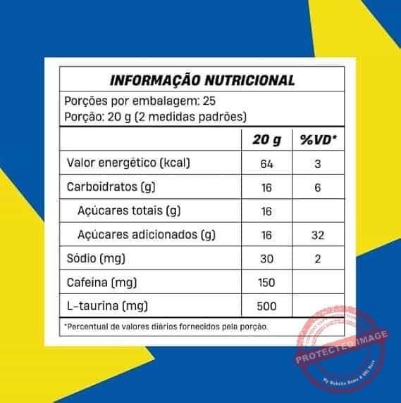Isomaltulose (Palatinose), taurina, cafeína, chá verde em pó, gengibre em pó, pimenta em pó, acidulante ácido cítrico, aromatizante sintético idêntico ao natural, corante natural curcumina, antiumectante dióxido de silício, espessante goma xantana e edulcorantes xilitol e glicosídeos de esteviol produzidos enzimaticamente.