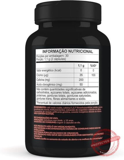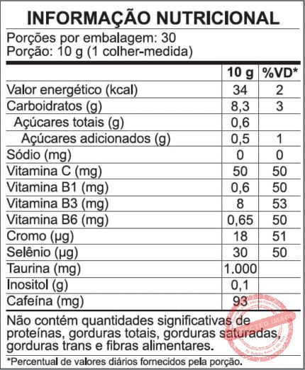 | Aditivos | Tirosina, café verde moído, fenilalanina, beta-alanina, extrato de laranja moro (Citrus sinensis L. Osbeck), ácido ascórbico (vitamina C), extrato seco de semente de uva, bisglicinato de zinco (zinco) |
