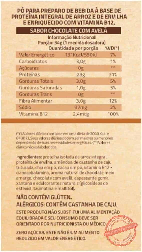 True Vegan Blend (Proteína isolada de arroz integral, proteína de ervilha), Amêndoa de castanha de caju triturada, chia em pó, cauca em pó, vitamina B12 – (cianocobalamina), aroma natural de chocolate amargo e chocolate com avelã, espessante goma xantana e edulcorantes naturais (glicosídeos de esteviol, taumatina e maltitol). NÃO CONTÉM GLÚTEN | ALÉRGICOS: CONTÉM CASTANHA DE CAJU. PODE CONTER SOJA E AMENDOIM.