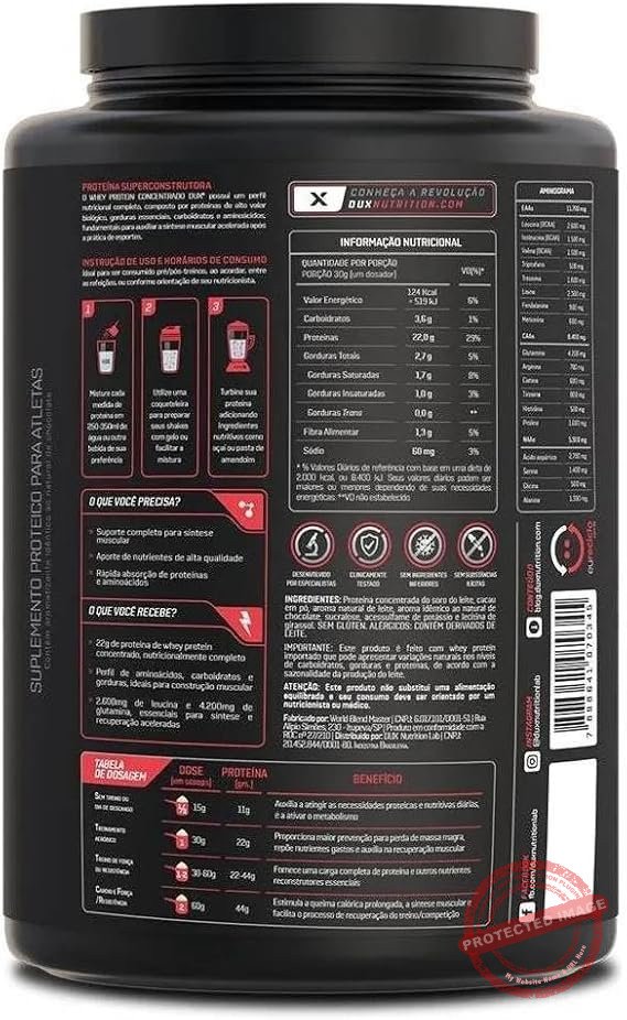 WHEY PROTEIN CONCENTRADO (900g) – DUX NUTRITION O Whey Protein Concentrado Dux Nutriton é composto por proteínas de alto valor biológico e rápida absorção, além de gorduras essenciais, carboidratos e uma ampla gama de aminoácidos, fundamentais para garantir a síntese muscular acelerada após a prática de esportes. É ideal para ser consumido antes e depois de treinos, mas também pode fazer parte do café da manhã ou servir como um lanche entre as refeições, e em outros momentos conforme a orientação do seu nutricionista. Se há um nutriente indispensável, é a proteína. Ela é feita de aminoácidos, que são os blocos de construção do nosso corpo. A proteína do soro do leite, em inglês ?Whey Protein?, é uma das fontes de aminoácidos de melhor absorção, maior até que o frango ou peixe. Isso torna o Whey uma forma conveniente de ingerir proteína, melhorando a saúde, o bem-estar e os resultados dos treinos. BENEFÍCIOS: > Não contém goma xantana, complexos vitamínicos à base de maltodextrina, espessantes, estabilizantes, conservantes ou qualquer outro ingrediente inferior;> Contém corantes 100% naturais, sem ingredientes artificiais;> O nome diz tudo: Whey Protein Concentrado 100% puro, com transparência total, do nome do produto à lista de ingredientes;> Matéria-prima premium importada, com alto teor de leucina, desenvolvida para criar um produto com sabor real e marcante;> Valores nutricionais robustos, sem excessos, com quantidades ideais de carboidratos e gorduras do leite;> 20g de proteína;> Proteína moderna, desenvolvida por especialistas para atletas de esportes de performance (bodybuilding, crossfit e artes marciais), pessoas que buscam uma proteína com baixa caloria (para snacks fit e receitas sem culpa) e pessoas que buscam uma proteína ultrapura de altíssima qualidade.